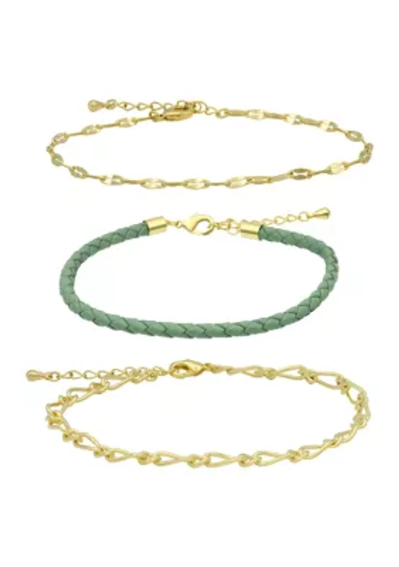 Gold Tone Chains and Green Leather Bracelet Trio Set