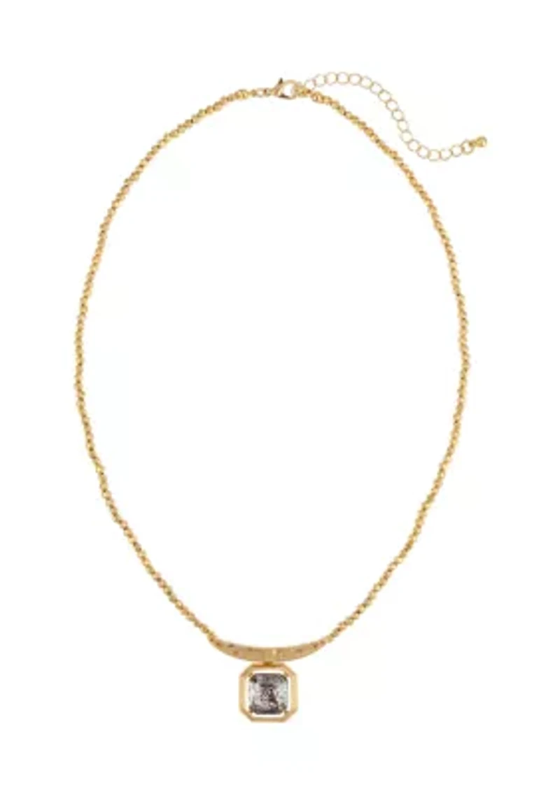 Gold Tone Hematite Short Framed Stone Pendant on Bar Necklace
