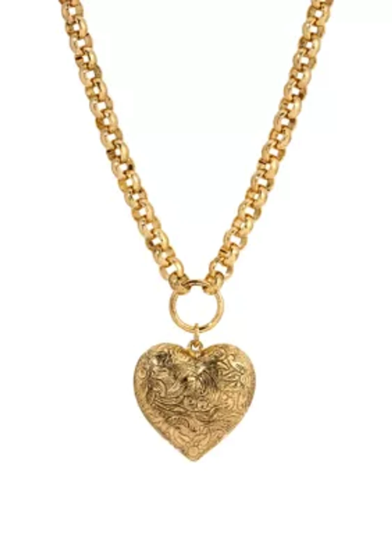 A rich 14K gold-dipped chain leads to an ornate heart locket, engraved with intricate floral scrollwork that catches the light from every angle. The textured links add weight and character, balancing vintage romance with a statement-worthy presence. Designed to rest beautifully at the neckline, this necklace brings warmth and detail to both everyday looks and dressed-up moments. Lobster closure Polished finish USA Imported Product Specifications 18"L X 1.1"W X 1.65"H, 18" Material & Care Metal, Gold-tone metal Clean with a soft cloth.