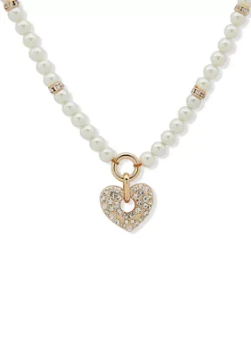 Gold Tone Pearl Crystal Heart Pendant Necklace