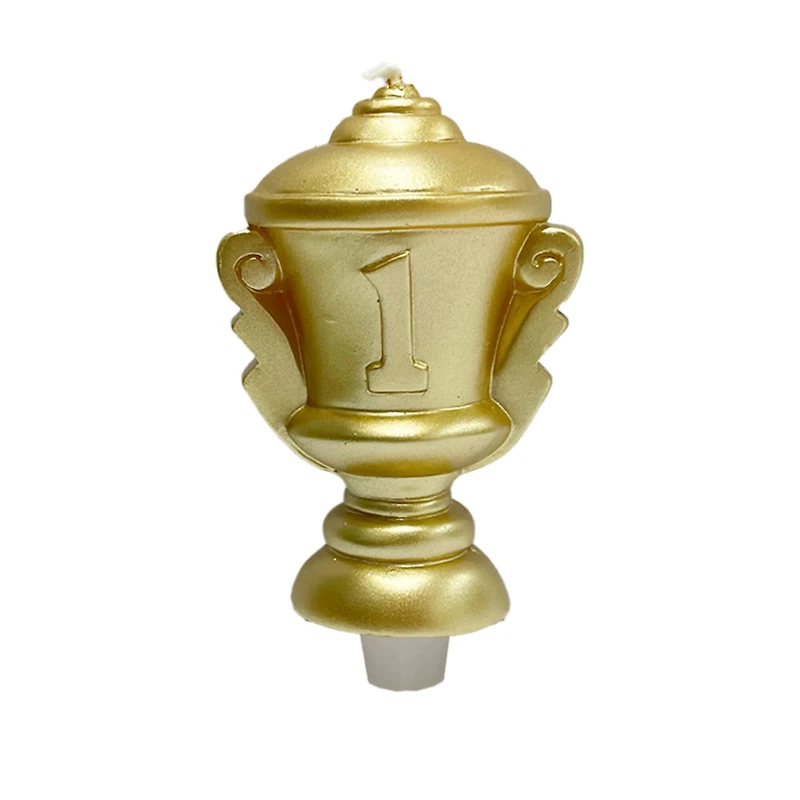 Celebrate a big win with this fun candle. Shaped like a gold trophy with a "1 "design, this cool candle can be used to decorate cakes or cupcakes for birthdays, awards ceremonies and other celebrations.Details:Gold trophy design3.25" (8.3 cm) tallParaffin waxWARNING: Burn within sight. Keep away from things that can catch fire. Keep away from children and pets.