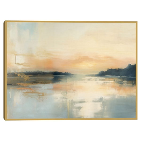 This Golden Hour Gaze Framed Canvas Art Print depicts soft skies melting into glowing reflections, capturing the hush of twilight. It brings a poetic escape to any room! Overall dimensions Width: 41 in. Depth: 1.5 in. Height: 31 in. Printed on stretched, polycotton blend canvas Gold frame around wrapped canvas Features a landscape subject Hues of yellow, blue, orange, and white Artist: Irena Orlov Weight: 9 lbs. Hangs from back-mounted hardware; sawtooth hangers included Care: Dust with a soft, dry cloth. This item is available at Kirklands.com only, not available in stores. Please note: this item cannot be shipped to APO/FPO addresses. WARNING: Cancer and Reproductive Harm - For more information go to www.P65Warnings.ca.gov .