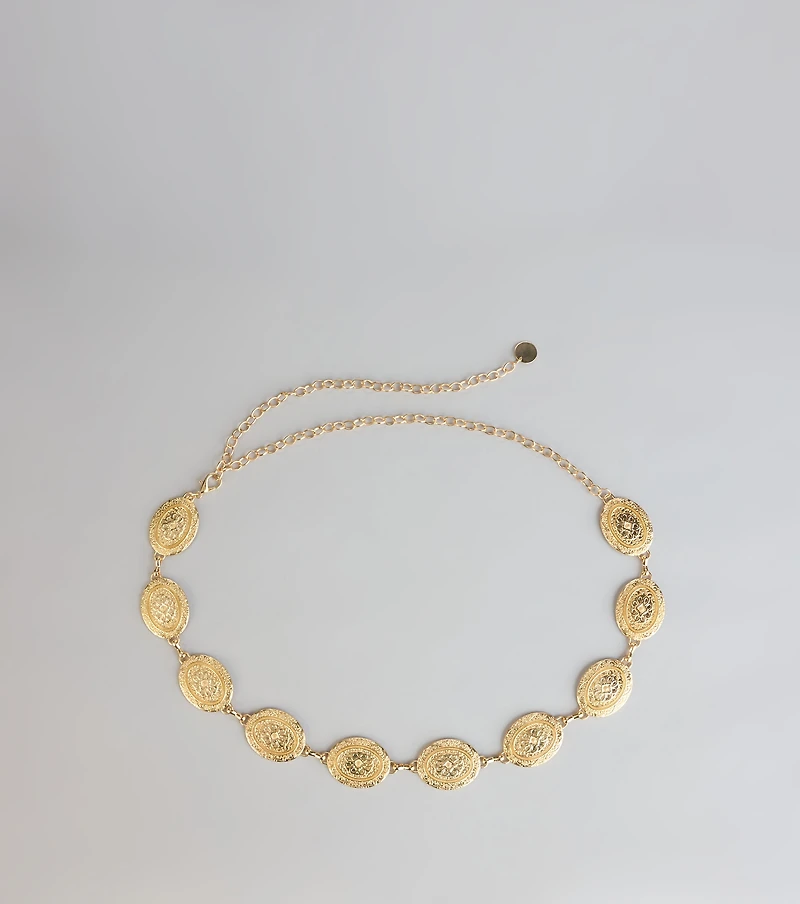 That extra detail your outfit was missing just showed up. This concho chain belt cinches your look with vintage-inspired shine and an adjustable fit, giving off a golden hour glow.