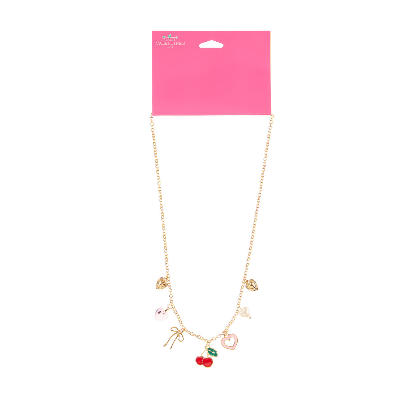 Happy Valentine's Day Goldtone Cherry, Bow, & Hearts Charm Necklace