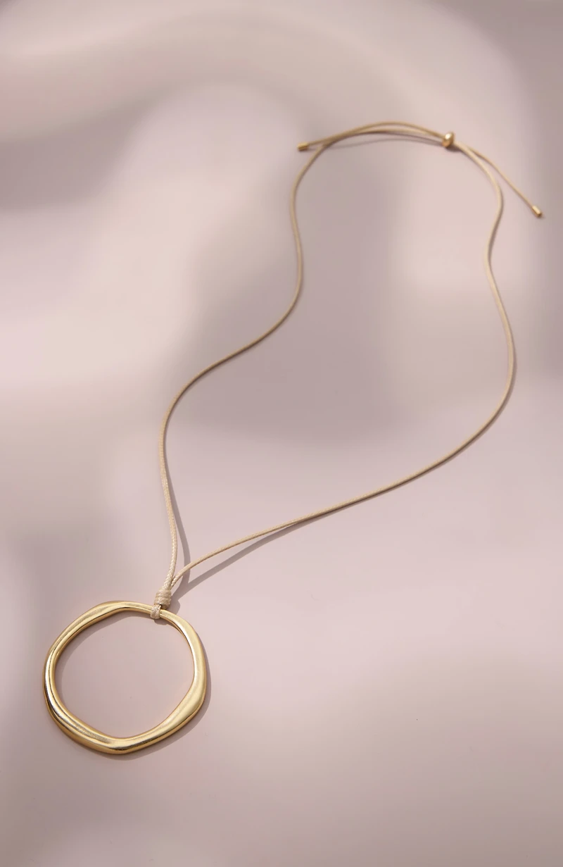 An open hammered metal pendant adorns our cotton-cord necklace, creating a simple yet stunning statement. Sliding knot.