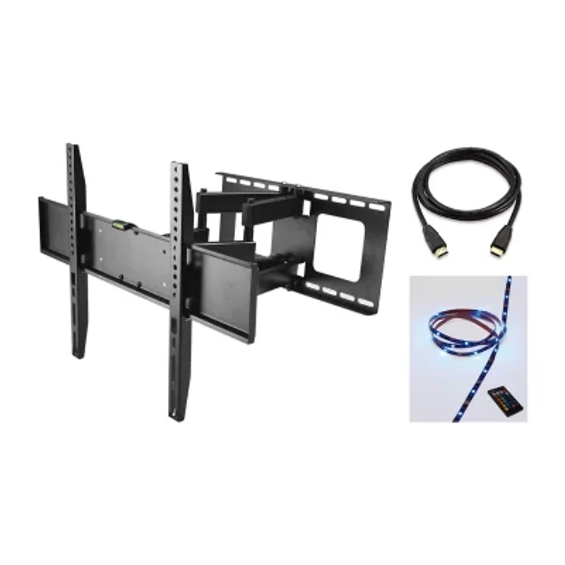 This full motion flat panel tv mount is engineered for quality and dependability, making it the perfect centerpiece for this tv mount value pack! The mount itself features an ultra-low profile, 20-degree tilt, and 120-degree swivel for customizable viewing angles for maximum viewing comfort. Support any flat panel tv up to 99lbs and 70". An included 6.5ft led light strip with remote adds a both eye-strain reducing backlight and aesthetic flair. The HDMI cable, full hardware kit, and simple mounting instructions make installation and hooking up your tv a breeze.