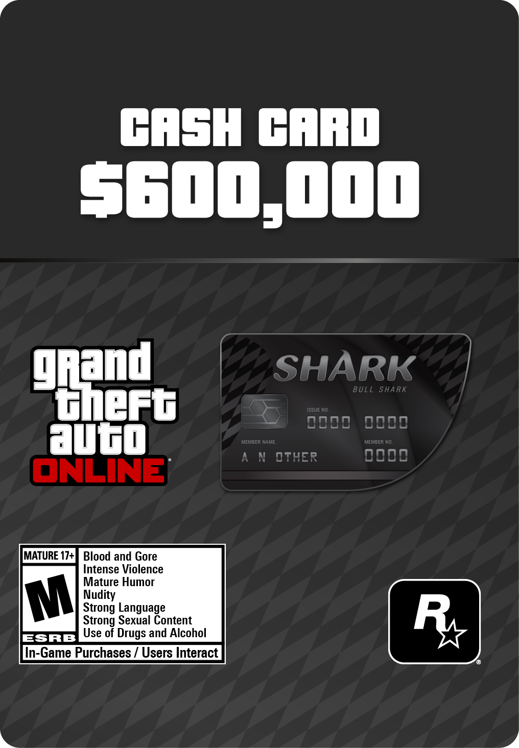 Purchase the Bull Shark Cash Card (Xbox Series X|S) to gain GTA$600,000 to spend in the Xbox Series X|S version of GTA Online. Cash is king in this town. Solve your money problems and help get what you want across Los Santos and Blaine County with the purchase of cash packs for Grand Theft Auto Online. All purchased cash is automatically deposited into your character’s bank account. Spend wisely, cash therapy is fleeting.