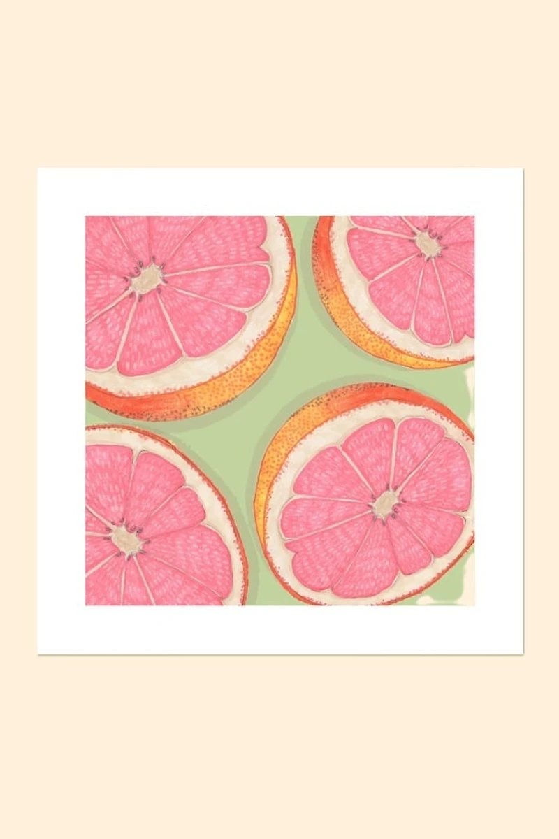 Create a bright, citrus-kissed sanctuary space with this playful grapefruit art print that celebrates the juicy beauty of this vibrant fruit through rich color and detail. Featuring sliced pink grapefruits set against a fresh green backdrop, this piece brings crisp, sunlit energy to kitchens, studios, bedrooms, or bohemian style gallery walls.Printed on archival paper for lasting quality and vibrancy, this limited-edition digital print is part of a release of only 100 prints. Each piece comes unframed, allowing you to style it in a way that feels personal to your space. Created by Dallas-based artist Suzana Gordon, owner of Earthbound Trading Company, this artwork reflects her deep love of nature and radiant color. Originally from Brazil, Suzana brings the vivid influence of her heritage and her background in surface pattern design to every piece she creates. Whimsical yet sophisticated, this limited-edition print adds a pop of color and a touch of nature-inspired joy to your collection. ~ Step inside Suzana's world and discover the inspiration and stories behind each piece: What inspires your designs, are there personal stories, memories, or experiences that often influence your work? I am inspired mostly by nature. Farmers markets especially remind me of my upbringing in Brazil, the unusual tropical fruits with their distinct aromas, textures, and abundance of bright and vibrant colors. What feeling or atmosphere do you hope people experience when they bring your pieces into their space? I hope my art can provide a soothing backdrop for modern living. That they can bring peace, joy, a sense of calm, and happiness into any dwelling. How do you approach choosing subjects, materials, or color palettes, and is there meaning behind those decisions? It’s subtle guidance from past trips, long hikes, and random encounters that have brought joy and meaning to my life; I try to hold on to the feelings and then express them through my art. What medium are your pieces created in? Ex: pencil drawing, ink pen, gauche painting, digital drawing, etc. I use ink pens, markers, watercolors, and gauche to add color and digital art programs when creating prints and patterns. Recently, I've fallen in love with screen printing and how imperfect it is.