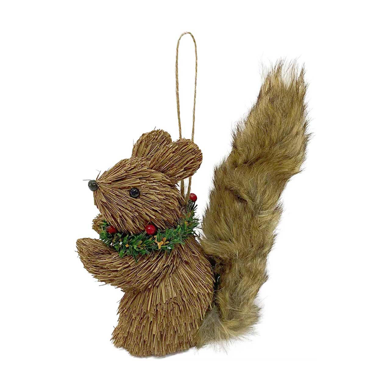 Bring a touch of woodland charm to your holiday decor with our delightful Grass Squirrel Ornament. This adorable ornament is meticulously crafted to resemble a cute squirrel, making it a perfect addition to your Christmas tree or seasonal displays. The squirrel is made from natural, grass-like materials, giving it a rustic and earthy appearance that stands out among traditional ornaments. Its body is beautifully detailed, with a textured finish that mimics the look of real grass, while its bushy tail adds an extra touch of realism and whimsy. Adorning its neck is a festive wreath made of faux greenery and red berries, adding a pop of holiday cheer to this charming little creature. The ornament comes with a sturdy twine loop, making it easy to hang on your tree, wreath, or anywhere you want to add a bit of nature-inspired beauty. This Grass Squirrel Ornament is not only a cute and unique decoration but also a great conversation starter. It’s perfect for nature lovers and those who appreciate the beauty of handcrafted decor. Add this enchanting ornament to your collection and watch it bring warmth and joy to your holiday season.