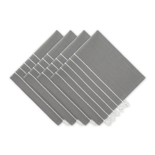 Give your table a fresh update with these Gray and White Striped Napkins. Their chic, understated style and cute tassel accents will add a touch of charm to every meal! Set includes four (4) napkins Each napkin measures 20L x 20W in. Crafted of 100% cotton Striped design Hues of gray and white Accented with tassels Care: Machine wash cold. Tumble dry low. Low iron. Wash separately before use. This item is available at Kirklands.com only, not available in stores. Please note: this item cannot be shipped to APO/FPO addresses.
