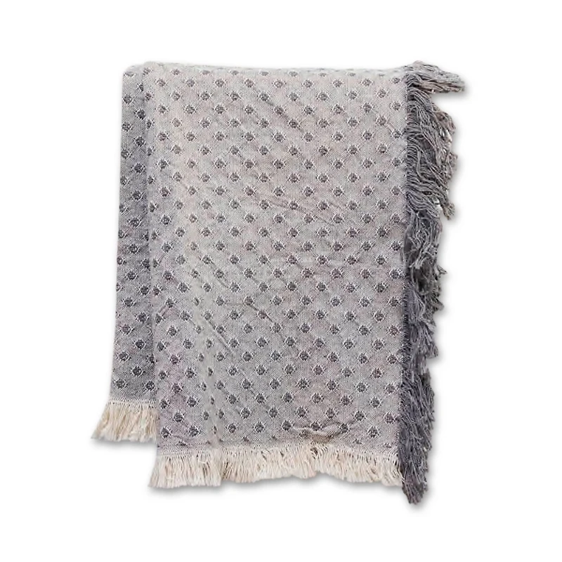 Our Gray Dotted Woven Throw will adorn your couch with vintage flair. Cozy up in style with the throw's comforting woven texture and classic design. Throw measures 46L x 67H in. Crafted of 100% cotton Dotted pattern Hues of gray and cream Accented with gray and cream fringe trim Care: Machine wash on gentle cycle with cold water and mild detergent. Use non-chlorine bleach when needed. Tumble dry on low heat setting. This item is available at Kirklands.com only, not available in stores. Please note: this item cannot be shipped to APO/FPO addresses.
