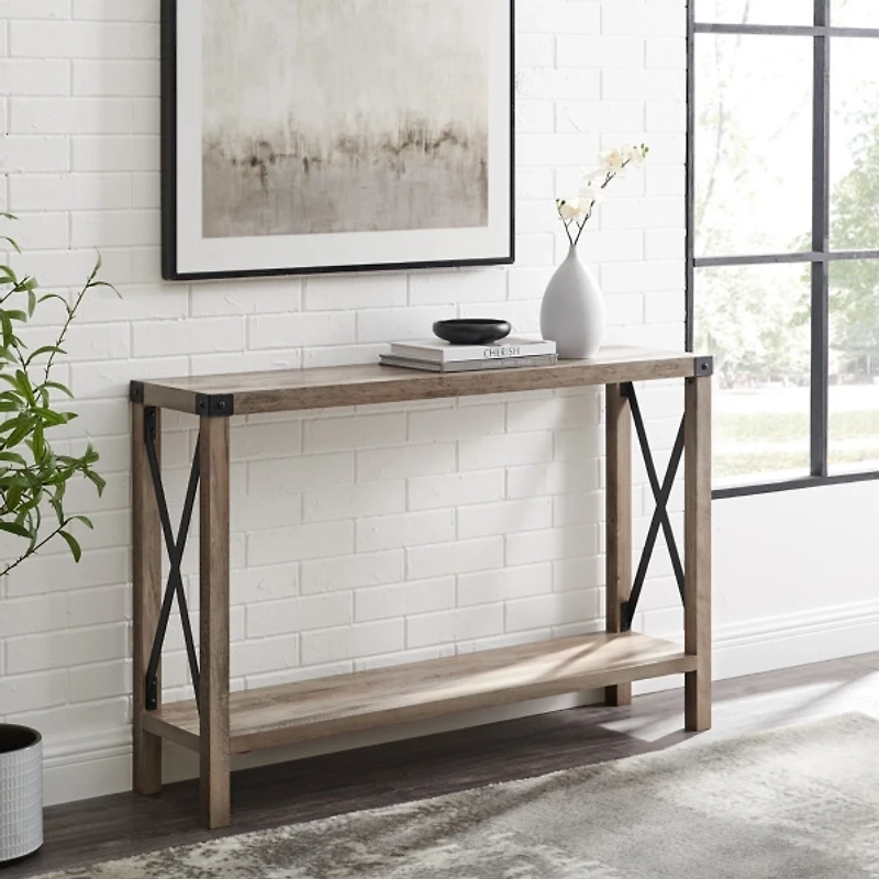 With this Gray Wash Farmhouse X-Frame Console Table, you’ll have a stylish entryway in no time! The urban-industrial and farmhouse styles create a warm and inviting feel within your home. It includes metal accents on the corners and x-shaped sides for an intriguing design. A lower shelf made from durable laminate provides a surface to decorate or a space for your shoes when you get home. Accent table measures 46L x 12W x 30H in. Crafted with laminate, metal, and warp-resistant wood composite Gray wash finish Black metal side frame finish Natural, wood grain details Metal x-shaped design on two (2) sides Bracket accents on top four (4) corners Features one (1) lower shelf for storage and display Rectangle shape Full assembly required Not intended for commercial use Care: Dust with a soft, dry cloth. This item is available at Kirklands.com only, not available in stores. Please note: this item cannot be shipped to APO/FPO addresses.