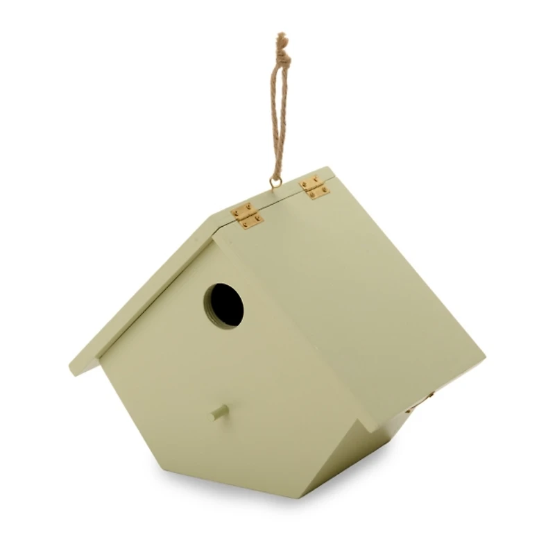 Create a cozy haven for your feathered friends with this Gray Wood Hanging Birdhouse! Equipped with a rope, this birdhouse is perfect for hanging from tree branches, hooks, or pergolas. Birdhouse measures 9.65L x 5.9W x 7.6H in. Crafted of plywood Gray finish Features a bird house design Weight: 1.10 lbs. Safe for outdoor use Care: Wipe with a soft, dry cloth. Contact your local Kirkland's store for availability. Quantities and selection may vary by location. Sold in stores under item number 338091.
