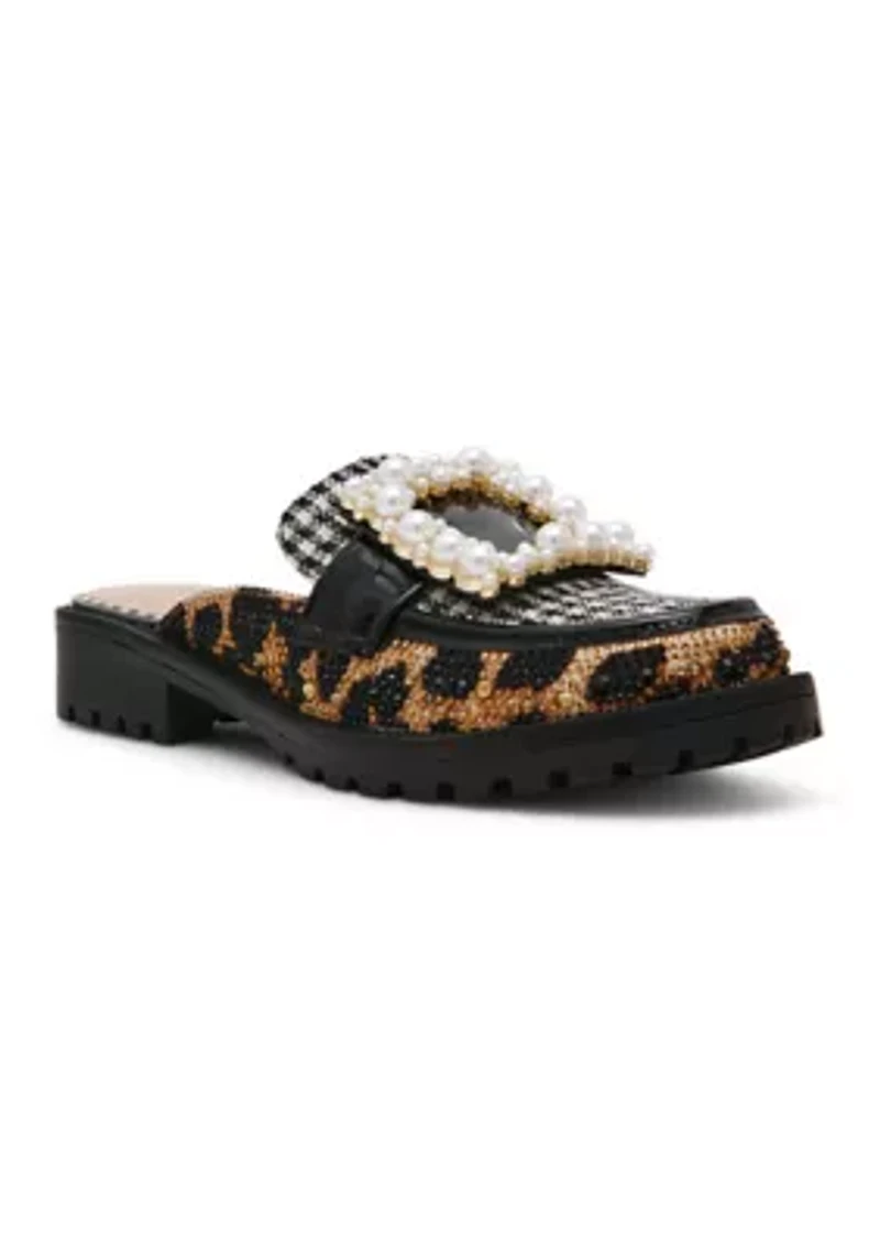 Add these slip-on mules from Betsey Johnson to your daily rotation. Covered in rhinestones and pearls for endless shimmer, these shoes offer a relaxed fit with a low heel, perfect for all-day wear. Slip-on Imported Product Specifications Medium width Material Fabric