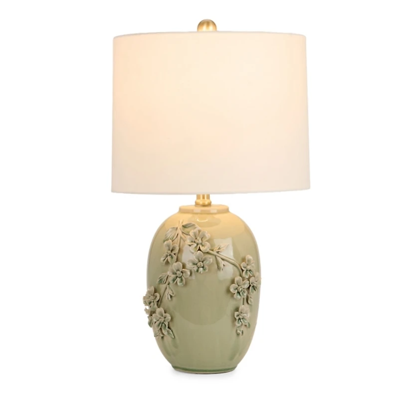 With a light sage finish and textured blooms, this Green Ceramic 3D Flowers Table Lamp brings fresh garden beauty to any space. It delivers the perfect touch of light for spring! Lamp measures 22.25H in. Crafted of ceramic Green finish Round base with 3D flowers Hardback drum shade in ivory fabric Shade measures 9.5H x 13 in. in diameter Socket accommodates a 100-watt, type A bulb Switch type: 2-way rotary switch on socket Features a clear, 5 ft. plug-in cord Care: Dust with a soft, dry cloth. Do not exceed specified wattage. Contact your local Kirkland's store for availability. Quantities and selection may vary by location. WARNING: Cancer and Reproductive Harm - For more information go to www.P65Warnings.ca.gov .