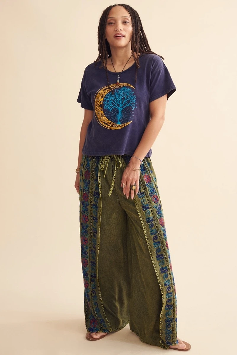 Meet your new wander-ready favorite. These boho split leg lounge pants are made from soft, lightweight viscose and bring effortless movement with every step. The open split pant legs create that breezy, free-spirited flow, while the boho floral embroidery along the sides adds a colorful, artisanal pop that feels instantly wanderlust-worthy.The elastic waistband with an adjustable tie gives you a comfortable, customizable fit, perfect for lounging barefoot at home, strolling markets, or dancing your way through sunny festival days. The acid wash green hue adds earthy character, making these pants an easy match for tanks, tees, and all your favorite boho layers. Lightweight, airy, and full of movement, these faux wrap pants are an easy go-to for anyone craving soft, comfy, and effortlessly bohemian style.
