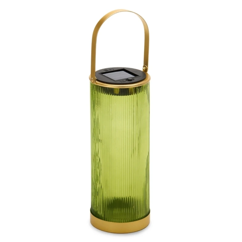 Light up your nights with this Green Glass Solar Lantern! Featuring a tall cylindrical design with textured ribbed glass and a warm golden base, this lantern adds a sophisticated touch to any outdoor space. Lantern measures 10H x 3.25 in. in diameter Crafted of glass and metal Green glass finish Gold metal finish Features a solar-powered light To charge: Press the "on" button and place in sunlight Charge time: 6-8 hours Care: Wipe with a soft, dry cloth. Contact your local Kirkland's store for availability. Quantities and selection may vary by location.
