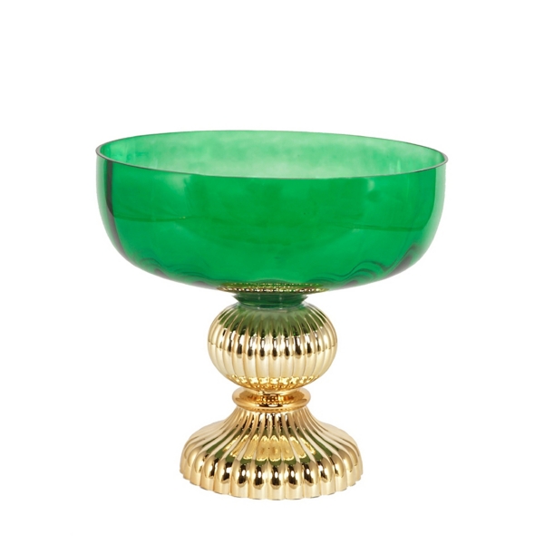 Get creative this holiday season with this elegant Green Glass Vase with Gold Pedestal Base! The green glass bowl is perfect for filling with all kinds of holiday décor, like Christmas ornaments, festive bowl filler, or seasonal florals! Vase measures 11.6H x 12.6 in. in diameter Crafted of glass Green top and gold base finish Bowl design For decorative use only Care: Dust with a soft, dry cloth. This item is available at Kirklands.com only, not available in stores. Please note: this item cannot be shipped to APO/FPO addresses.