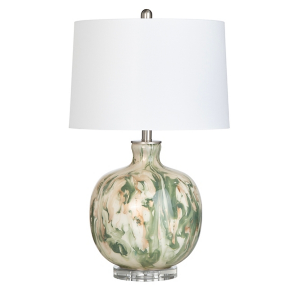 This Green Waverly Glass Table Lamp features ribbons of rich color that swirl together beautifully, creating a one-of-a-kind look. It's sure to stand out in any room! Lamp measures 26.75H in. Crafted of glass and metal Orb base with a marbled pattern Hues of green, cream, and gold Hardback drum shade in white fabric Crystal base detail Shade measures 10.5H x 16 in. in diameter Socket accommodates a 150-watt, type-A bulb Features a , plug-in cord Care: Dust with a soft, dry cloth. Do not exceed specified wattage. This item is available at Kirklands.com only, not available in stores. Please note: this item cannot be shipped to APO/FPO addresses.