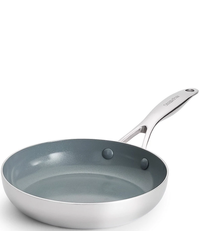 From GreenPan, this 8" open frypan features: Ideal for eggs, sides, and hundreds of other tasks, this versatile frypan features a stunning mirrored finish on a versatile 3-ply stainless steel body and our groundbreaking Infinite8 ceramic nonstick for incredible daily performance. The unique mirrored finish on this pan’s 3-ply stainless steel body adds show stopping style to any stovetop. The pan features Infinite8 is the 8th generation of GreenPan’s iconic ceramic nonstick coating, the most advanced they’ve ever made. It’s metal utensil safe, lasts longer, performs better, and it makes every meal healthier. Thermolon™ Infinite8—GreenPan’s most state-of-the-art ceramic nonstick coating, metal utensil safe, free of PFAS, PFOA, lead, and cadmium Mirrored 3-ply stainless steel design delivers fantastic heat transfer, easy searing, and better browning Chip-resistant rims are specially designed to prevent bumps and chips where your pan needs it the most Polished stainless steel handles riveted for extra stability and easy oven transfers The tempered glass lid makes it easy to keep an eye on your meal-in-progress without losing heat All stovetops, including induction Metal utensil safe Oven and broiler safe up to 600°F Hand wash recommended Overall Measures 8.11" dia. x 3.3" H x 14.84" L (including handles) Imported.