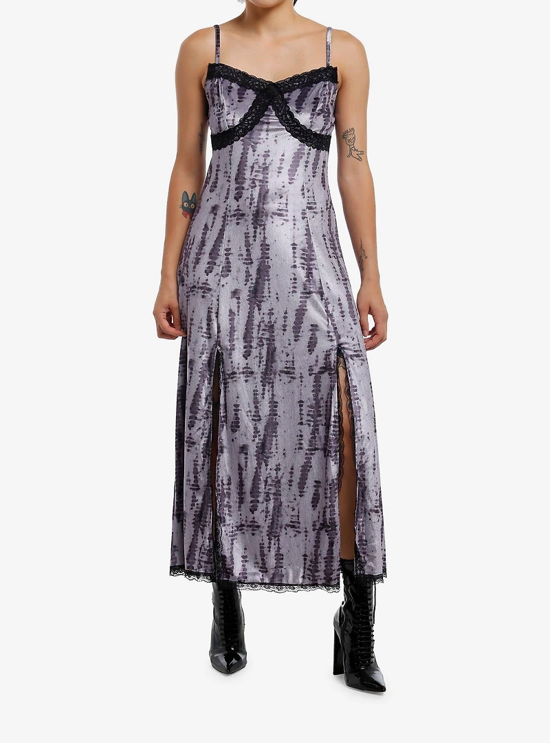 Unleash your inner dark goddess in this romantic midi dress! It features velvet with a blueish grey wash. Comes with black lace detailing around the bust and the hem. Complete with two front slits and adjustable cami straps. Please note: Wash pattern may vary.