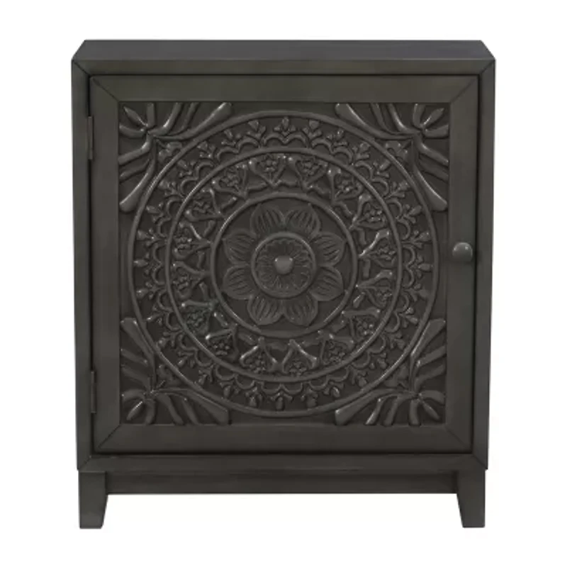 Rich in detail, this Linon accent cabinet creates a bohemian look that will enhance any room in your home. A multi-step process brings further depth to the dark brown finish. The front has a look of being hand carved medallion pattern that will certainly be a conversation starter. The piece opens to one fixed interior shelf for storage and organization. The round wooden knob and short, straight legs bring finishing touches to this fully assembled piece.