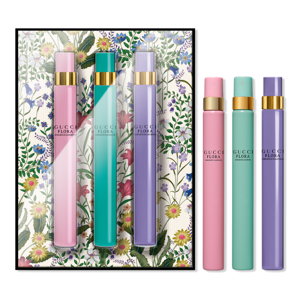 . Fragrance Family: Floral. Key Notes: Top - Flora Gorgeous Gardenia: Pear blossom Flora Gorgeous Jasmine: Mandarine Essence Flora Gorgeous Magnolia: Dewberries Accord. Middle - Flora Gorgeous Gardenia: White Gardenia, Jasmine Flora Gorgeous Jasmine: Grandiflorum Jasmine, Magnolia Accord Flora Gorgeous Magnolia: Magnolia essence. Base - Flora Gorgeous Gardenia: Brown sugar Patchouli Flora Gorgeous Jasmine: Sandalwood Flora Gorgeous Magnolia: Patchouli essence. Includes: Flora Gorgeous Magnolia Pen Spray (0.33oz). Flora Gorgeous Jasmine Pen Spray (0.33oz). Flora Gorgeous Gardenia Pen Spray (0.33oz).