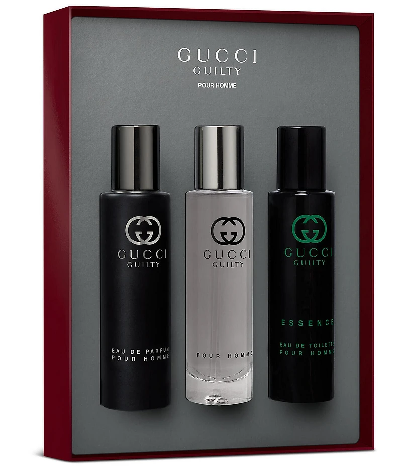 Share Gucci Beauty Love with this Gucci Guilty gift set for men, featuring an aromatic fougère fragrance. This fragrance gift set for men contains: Gucci Guilty Pour Homme Eau de Toilette Travel Spray 0.5oz/15ml Gucci Guilty Pour Homme Essence Eau de Toilette Travel Spray 0.5oz/15ml Gucci Guilty Pour Homme Eau de Parfum Travel Spray 0.5oz/15ml