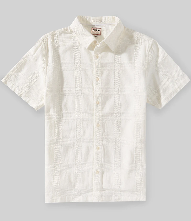 From Guess, this shirt features: Jacquard texture Spread collar Short sleeves Button-front closure Straight hem Woven cotton Machine wash/tumble dry Imported.