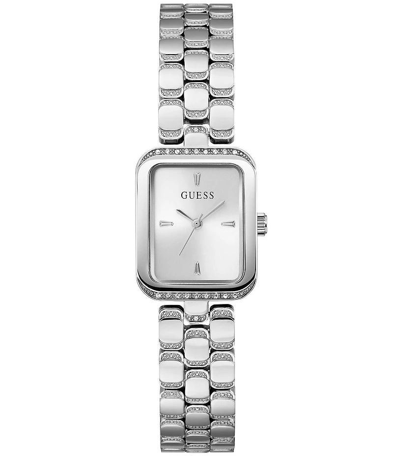 From Guess, this women's watch features: Stainless steel bracelet and case Silver sunray dial G-link self adjustable buckle closure Analog movement Case size approx. 22mm x 14mm Water-resistant up to 10 ATM Imported.