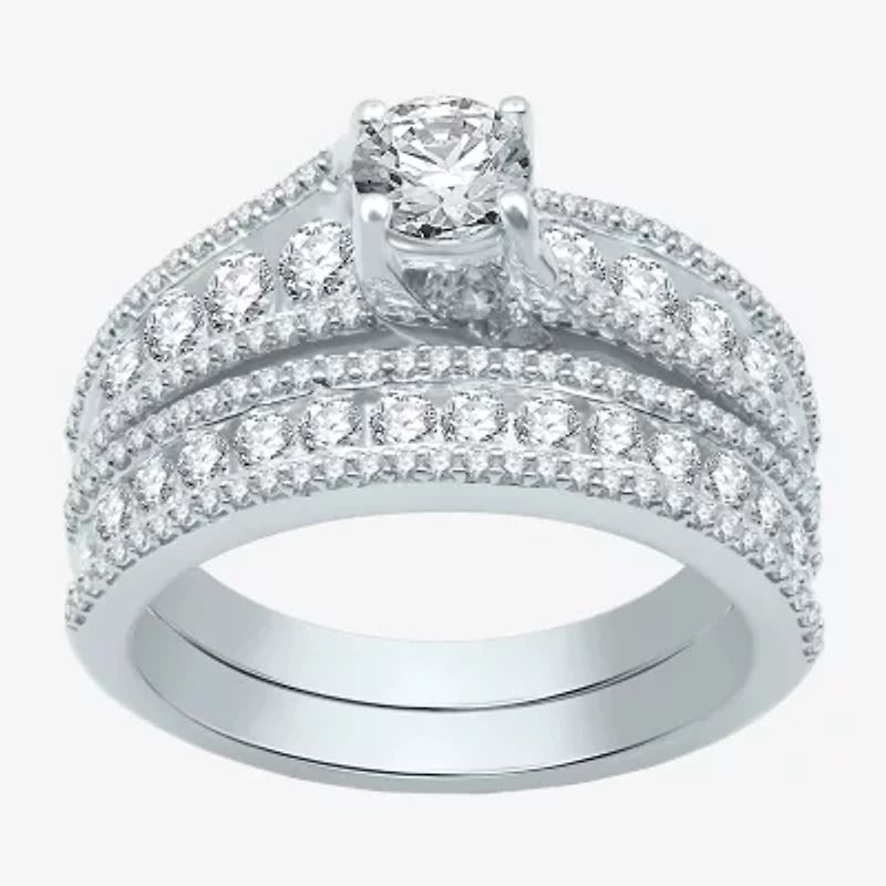 (H-I / I1) Womens 2 CT. T.W. Lab Grown White Diamond 10K Gold Round Side Stone Halo Bridal Set