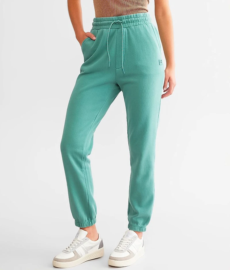Washed fleece lined jogger Inseam measures 27" Rise measures 12 1/2" Elasticized cinch tie waistband Elasticized bottom openings