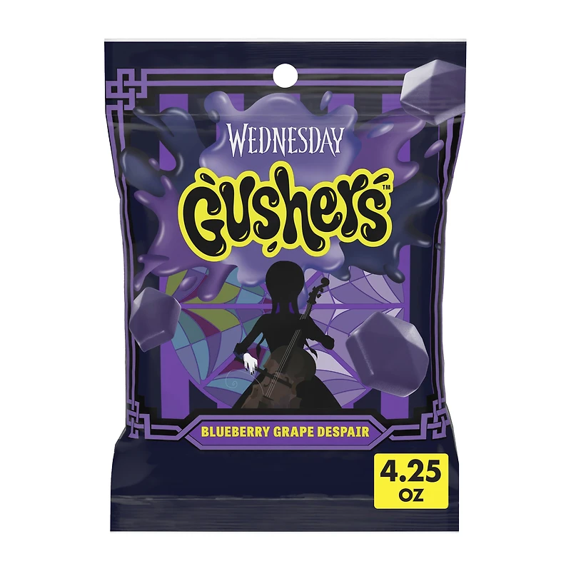 - Squeeze into despair with Wednesday-inspired Gushers! Blueberry grape flavor for a ghoulishly tasty treat.