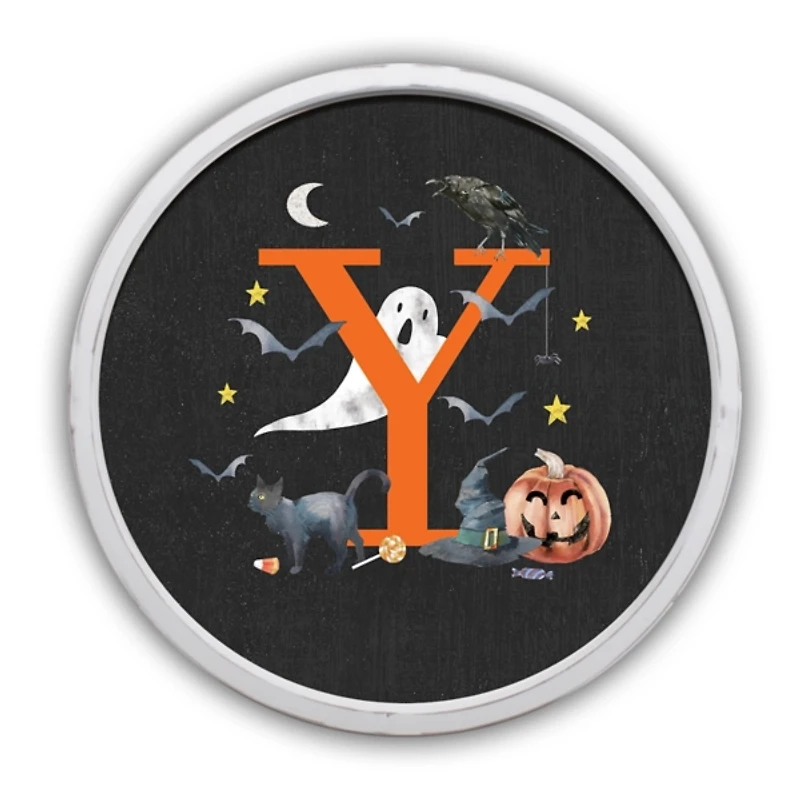 Put a spooky spin on your personal style with this Halloween Monogram Y White Framed Wall Plaque! Hung anywhere in your haunted home, it adds a festive yet frightening touch! Plaque measures 1.4W x 20 in. in diameter Crafted of wood White frame finish Black background finish Features monogram "Y" Accented with Halloween-themed designs Hues of black, orange, white, and yellow Weight: 1.9 lbs. Designed and printed in the USA Hangs from back-mounted hardware Care: Dust with a soft, dry cloth. This item is available at Kirklands.com only, not available in stores. Please note: this item cannot be shipped to APO/FPO addresses.