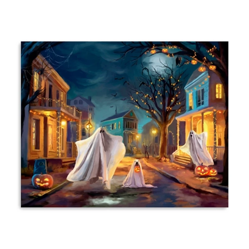 Step into a spellbinding Halloween night with this enchanting Halloween Street Party Canvas Art Print! This artwork blends spooky charm with cozy nostalgia, making it a perfect seasonal centerpiece for your home. Overall dimensions Width: 30 in. Depth: 1.25 in. Height: 24 in. Distinctively printed on stretched canvas Wrapped edges complete the look Features ghosts in the street design Hues of orange, blue, white, yellow, black, and brown Artist: Gia Hoang Weight: 2.46 lbs. Hangs from back-mounted hardware Made in the United States Care: Dust with a soft, dry cloth. This item is available at Kirklands.com only, not available in stores. Please note: this item cannot be shipped to APO/FPO addresses.