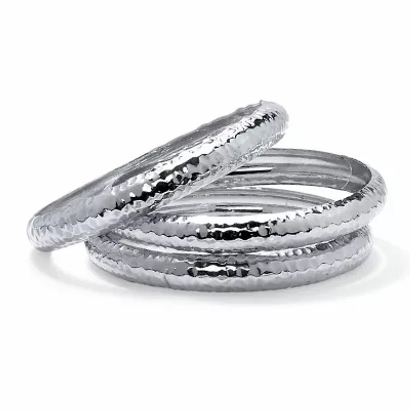 Pile em high.... Seen on the runway, tons of bangle bracelets spice up new season looks and we bring you the best in this must-have hammered-style bangle bracelet set of three. 8.5" lengths. Silvertone.SilvertoneMeasures: 11 mm wide x 8.5 inches long x 4.5 mm highIncludes gift box and drawstring pouchSilvertoneBracelet Dimensions: 11 mm wide x 8.5 inches long x 4.5 mm highIncludes gift box and drawstring pouch 3 No clasp Polished finish Warranty available China Imported Product Specifications 0.61 in x 8.5 in x 0.43 in, 8.5" length Material & Care Metal, Silver-tone metal Clean with a soft cloth.