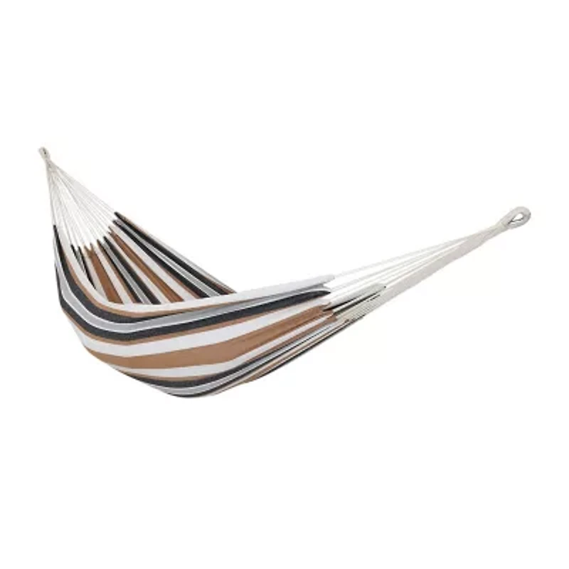 Relax the hours away with a nap, a book, or snuggling with a loved one in this cozy hammock. The traditional Brazilian style will cocoon its users into immediate comfort while the soothing neutral colors of its white, gray, black, and brown stripes will add an attractive view for any space. Tightly woven cotton fabric creates durability and works great with the Sunnydaze universal hammock stand if there are no trees (not included).
