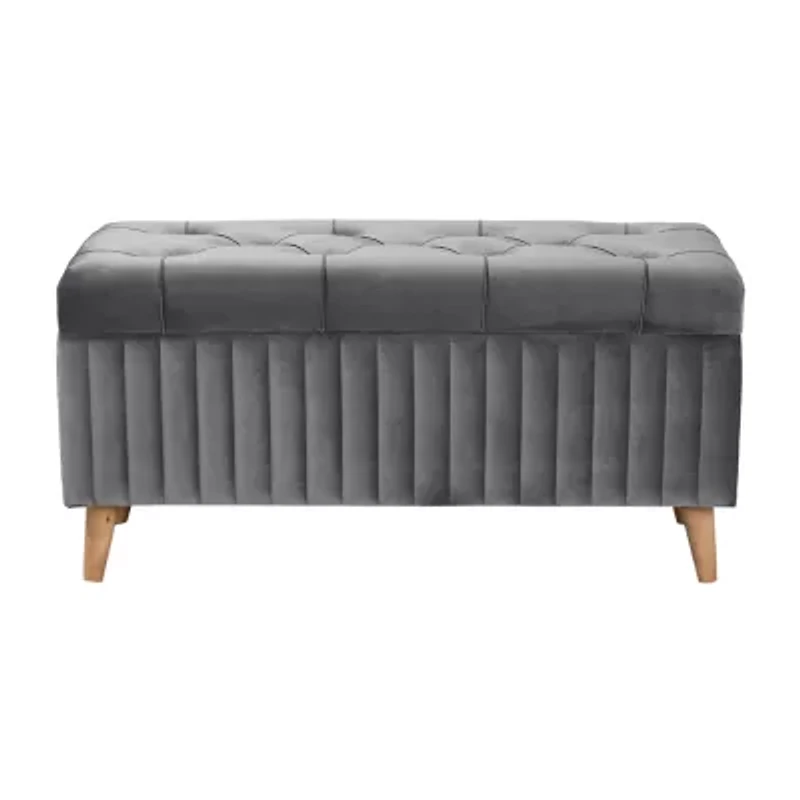 Give your space a modern update with the elegant design of the Hanley ottoman. Made in china, the Hanley features a sturdy wood frame padded with foam and upholstered in luscious velvet fabric. Elegant channel tufting on the sides and a button tufted cushion create a visually striking display from any angle. Requiring assembly, the top of the Hanley opens to reveal plentiful storage space for extra blankets and pillows. Angled wood legs complete the look, making the Hanley ottoman a remarkable addition to the modern home. Seating dimensions: 18.9" high x 39.4" wide x 16.5" deep; legs: 4.7" high; inner storage dimensions: 12.2" high x 37.8" wide x 15" deep.