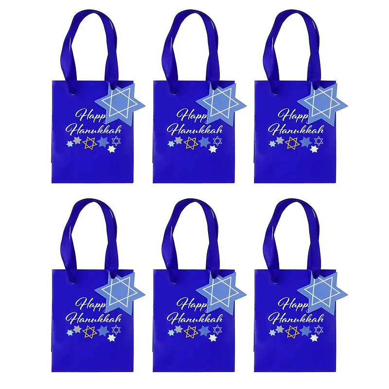 This Hanukkah gift bag set is perfect for giving gifts to family and friends. Customize each with well wishes by adding a gift tag.Details:Blue4" x 5.25" x 2" (10.2cm x 13.3cm x 5cm)6 mini gift bags120 gsm art paper, ribbon