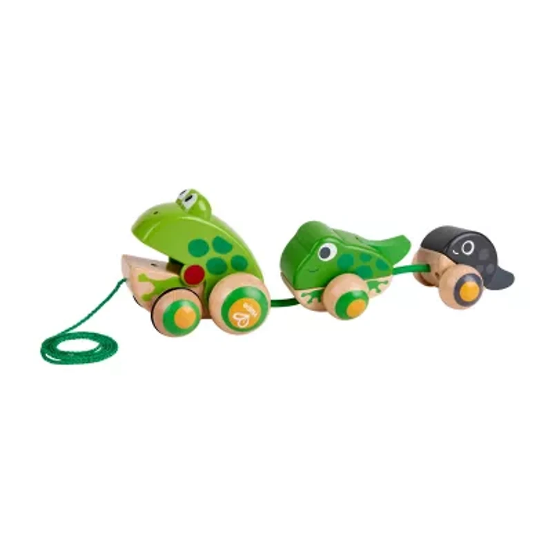 HAPE PULL-ALONG: FROG FAMILY - This lovely mama frog is taking her little ones for a walk. Pull the string and watch her open & close her mouth. As you pull this frog family, you will see mama walk with her froglet and little tadpole wobbling along behind. Wheels are rubber-rimmed and won`t scratch the floor. A wonderful demonstration of the frog life cycle and great for getting kids interested in nature. Great pals for little walkers. Product Dimensions (L x W x H): 14 x 4.4 x 3.7 inches. This toy set is made from child-safe paint finishes and durable wooden materials. The solid construction makes this a long-lasting toy your child can play with for years to come.HAPE: Love Play, Learn. Children are our future. Our main value is serving children, and our mission is to help them to grow and learn happily. The children's smile is Hape's ultimate force, keeping us running with determination.