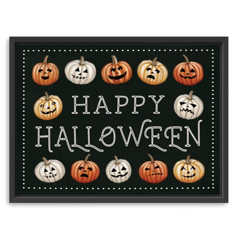 This Happy Halloween Jack-o-Lanterns Framed Art Print is sure to inspire your next jack-o-lantern design this season! This print is perfect for giving your home a festive, slightly spooky look this Halloween! Overall dimensions Width: 26 in. Depth: 1.75 in. Height: 20 in. Distinctively printed on stretched canvas Wrapped in a black wood frame Reads, "Happy Halloween" with a jack-o-lantern border Hues of white, black, orange, gray, and brown Artist: Elizabeth Tyndall Weight: 6.49 lbs. Hangs from back-mounted hardware Care: Dust with a soft, dry cloth. This item is available at Kirklands.com only, not available in stores. Please note: this item cannot be shipped to APO/FPO addresses.
