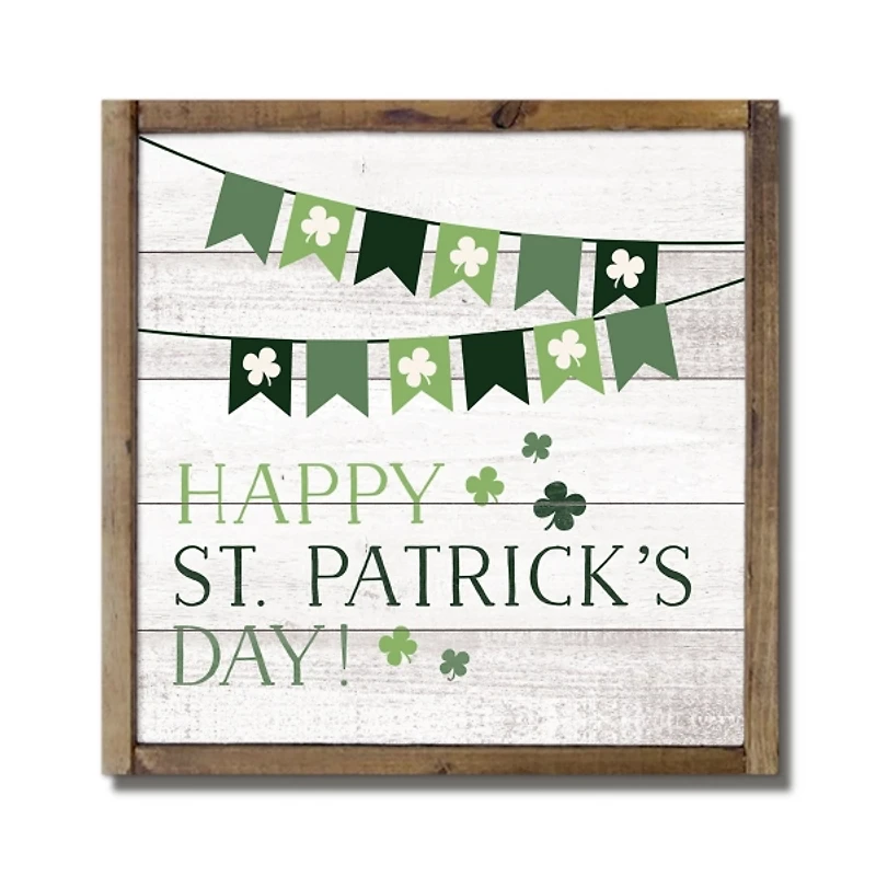 Our Happy St Patricks Day Framed Wall Plaque makes for the perfect St. Patrick’s Day party decoration. Hang this plaque in your entrance way to festively greet your guests! Plaque measures 13.5L x 1.5W x 13.5H in. Crafted of poplar Brown frame finish White wood plank background Features the text "Happy St. Patrick’s Day" Accented with shamrocks and a shamrock banner Uses fade-resistant UV inks for long-lasting artwork Hues of white, grey, brown, black, and green Square shape Weight: 1.38 lbs. Designed and Printed in the USA Hangs from back-mounted hardware; sawtooth hangers included Care: Dust with a soft, dry cloth. This item is available at Kirklands.com only, not available in stores. Please note: this item cannot be shipped to APO/FPO addresses.