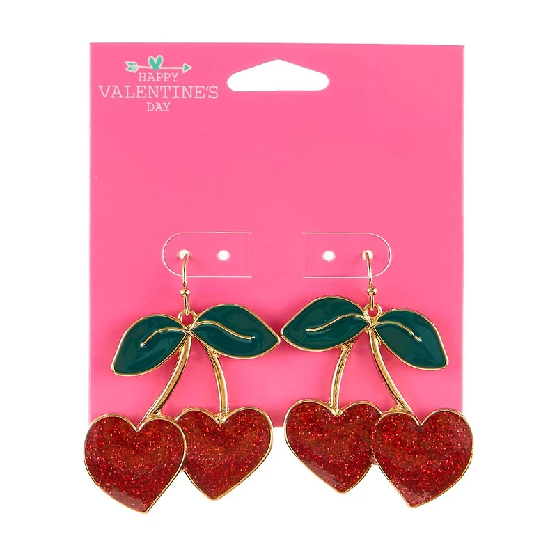 Happy Valentine's Day Goldtone Heart Shaped Cherry Drop Earring