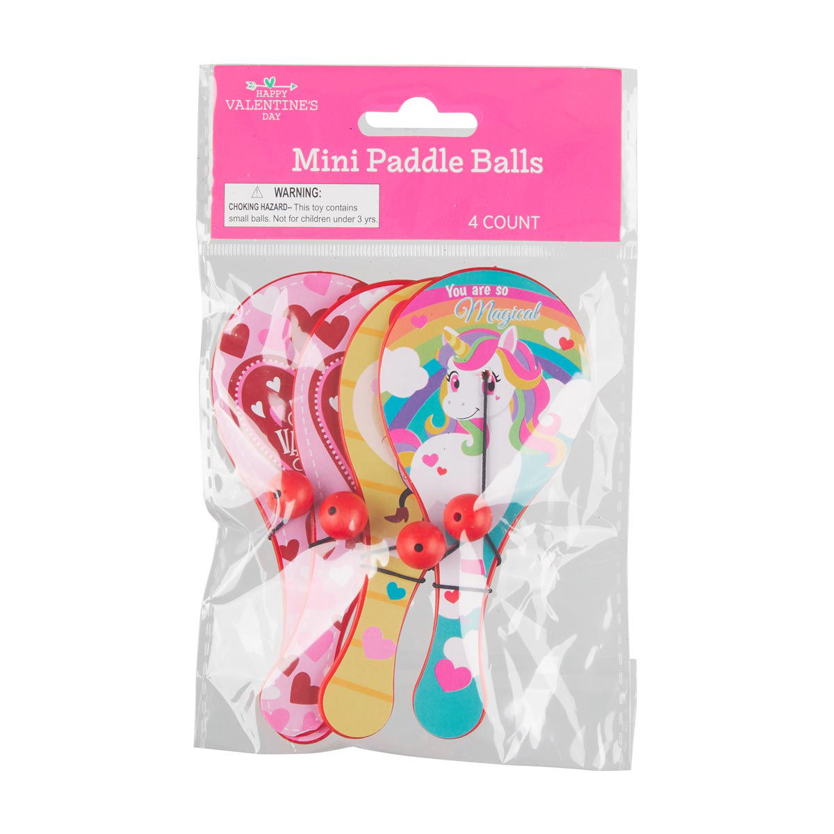 - Pack includes 4 mini paddle balls with assorted Valentine's Day designs