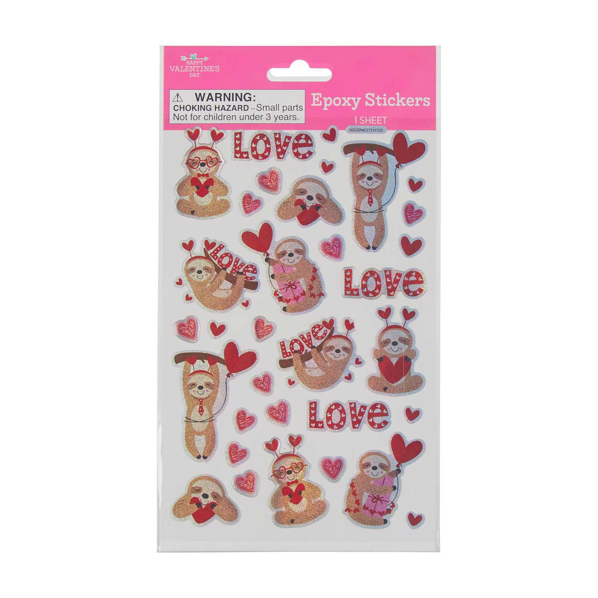 1. **Lovable Sloths**: These epoxy stickers showcase cute sloths in various heartwarming poses, holding hearts and gifts, surrounded by the word "Love" and an array of charming heart designs. The intricate detailing and vibrant colors make these sloths an irresistible addition to any Valentine's craft project.