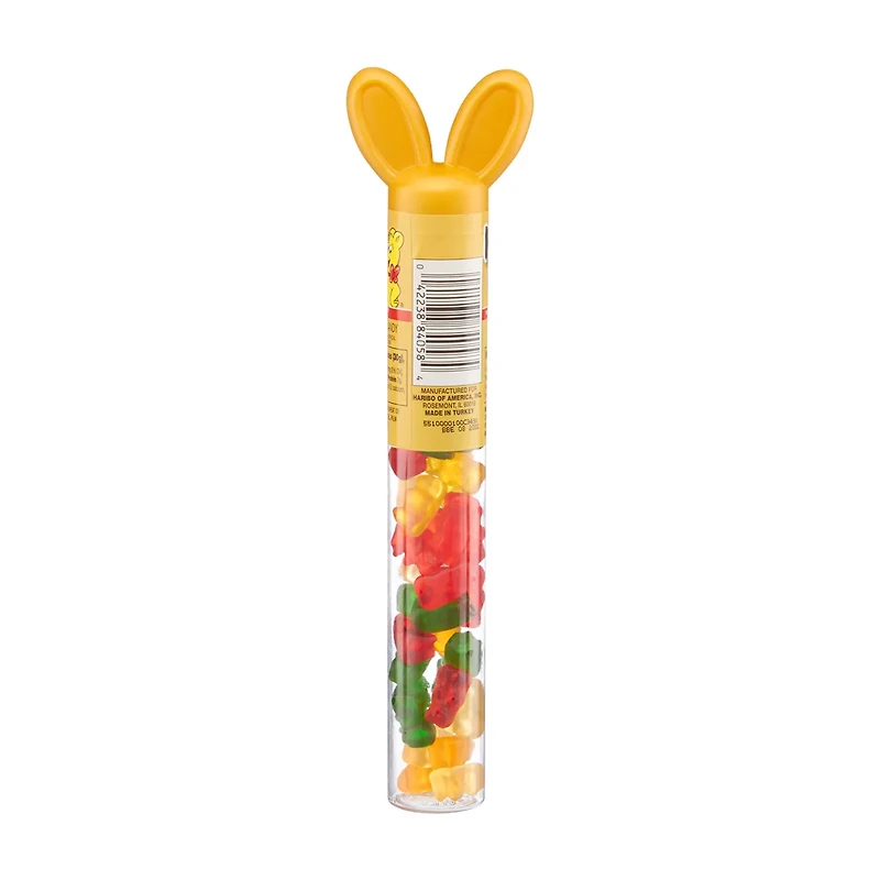 Enjoy this Haribo Easter Filled Bears Candy, a mouthwatering treat for the festive season. These candies come packed in a resealable tube with a bear shape at the top, making it convenient to carry, store, and share. The candies are made from premium ingredients and are available in five fruity flavors: strawberry, orange, lemon, pineapple, and raspberry.