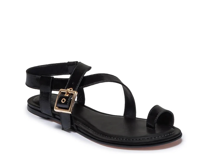 The Hartshorn sandal from Bernardo brings a fresh take to warm weather footwear with its toe loop silhouette and asymmetrical straps crafted in crinkle gloss leather. This design features buckle and grommet accents that add a subtle edge, making it an ideal choice for effortlessly moving from daytime errands to evening outings with a polished yet contemporary vibe.