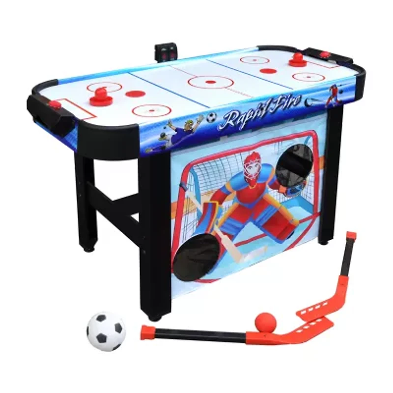 Put boredom in the penalty box with the Rapid Fire 3-in-1 Air Hockey Multi-Game Table. This versatile table features three awesome games in one. Kids will enjoy a fast-paced game of thrilling air hockey, kick a game-winning soccer goal, or drive the ball into the net with a buzzer-beating slap shot. This table is built to last, with engineered wood construction and cross-support bracing. A super-slick, poly-sealed playfield resists scratches and scrapes. Independent leg levelers ensure stable play on any surface. Excite your kids with real-world fun with this multi-functional system. With a compact, space-saving design, the Rapid Fire is perfect for your play room, game room, or anywhere else in your home. 180-day limited warranty.