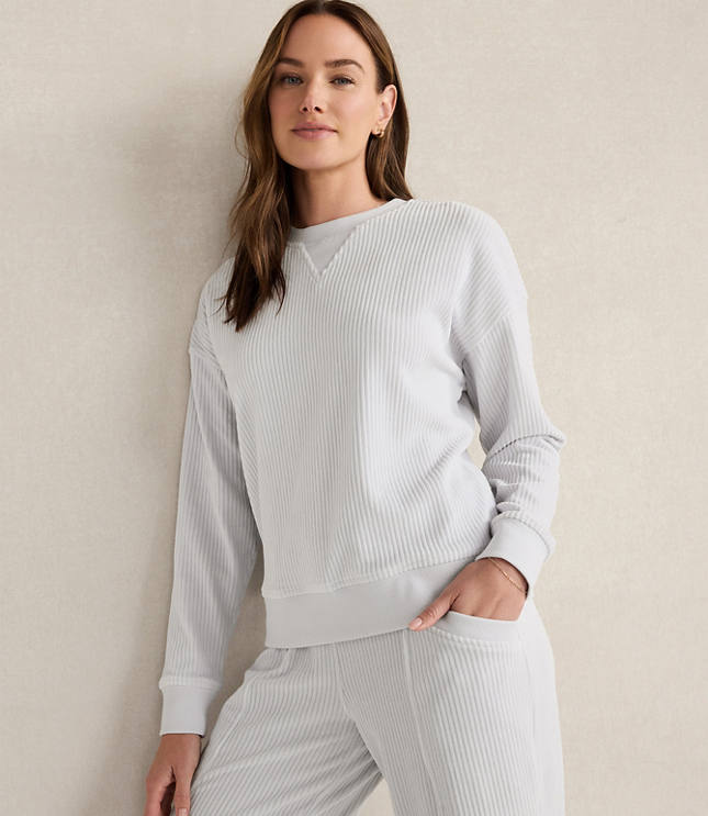 Haven Well Within. A thoughtful collection of lounge, sleep home and lifestyle essentials your trusted resource for all things wellbeing. The plush, velvety feel of velour meets the textured comfort of corduroy. This casual crewneck is made from an organic cotton blend and pairs perfectly with the Corded Velour Pants., Hit: Hits at hip, Imported:, Length: 23 1/2"long, Fabrication: 68% Organically Grown Cotton 29% Polyester 3 Spandex, Garment Care: Machine Washable Loft Haven Well Within Corded Velour Crewneck Pullover Size Small Glacier Freeze Women's by Loft Size Regular - S Glacier Freeze Women's Velvet / Velour, Crew Neck Long Sleeve Pullover Tops Casual 68% Organically Grown Cotton 29% Polyester 3% Spandex Machine Washable