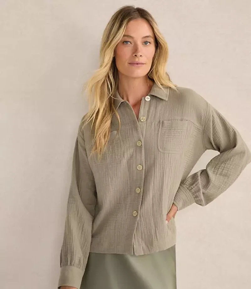 Haven Well Within. A thoughtful collection of lounge, sleep home and lifestyle essentials your trusted resource for all things wellbeing. The'it fabric for summer has arrived. Featuring a button front closure and slightly cropped silhouette, this jacket will become your new summer go - to. It's irresistibly soft and light thanks to our beloved, double layered gauze fabric. Long sleeves Button front closure., Hit: Hits slightly above hip, Imported:, Length: 24"long, Fabrication: 100% Organically Grown Cotton, Garment Care: Machine Washable Loft Haven Well Within Organic Cotton Gauze Jacket Size 2XL Vetiver - Haven Women's by Loft Size Regular - 2XL Vetiver Haven Women's 100%, Organically Grown Cotton Machine Washable
